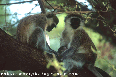 An adolescent female vervet monkey gently touches her mother's newest baby in Kenya